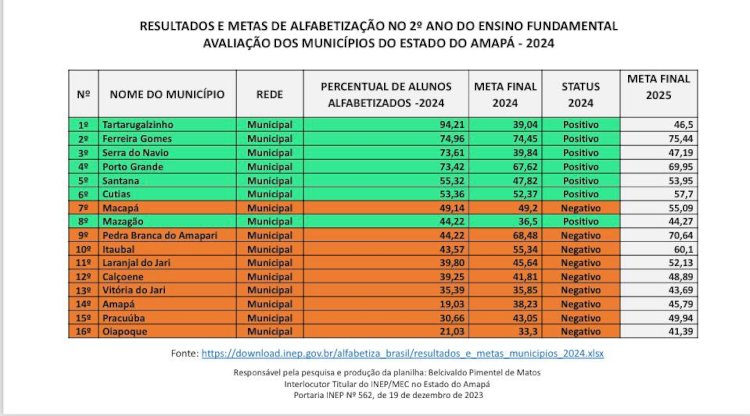 Uma planilha produzida por Belcivaldo Pimentel de Matos, interlocutor titular do Instituto Nacional de Estudos e Pesquisas Educacionais Anísio Teixeira, Ministério da Educação (INEP/MEC), mostra os Resultados e Metas de Alfabetização no 2º ano do Ensino Fundamental - Avaliação dos municípios do Estado do Amapá - 2024. Macapá ocupa a sétima posição, com 44,22�alunos alfabetizados, finalizando com status negativo, atingindo meta final de 55,09%.