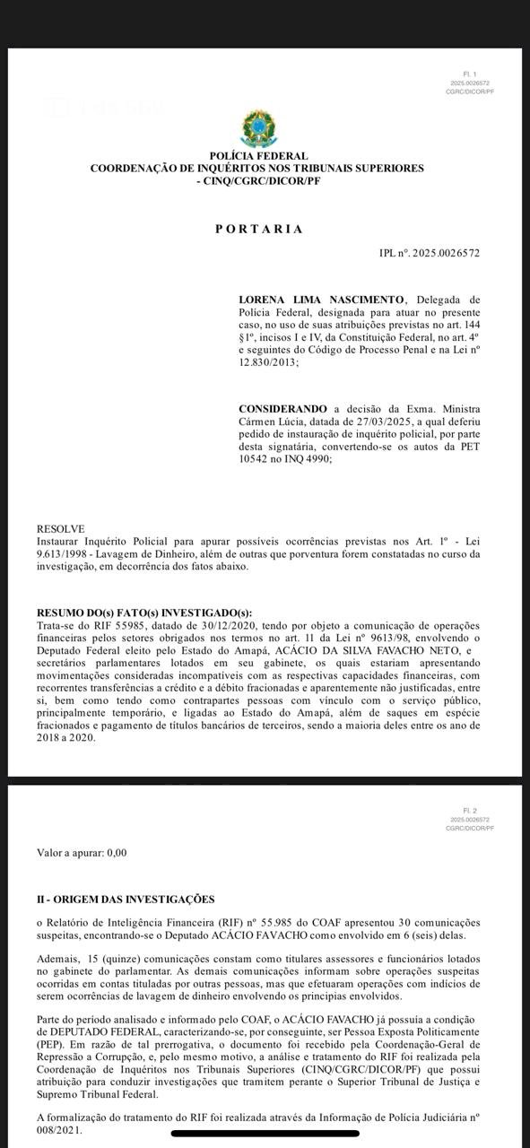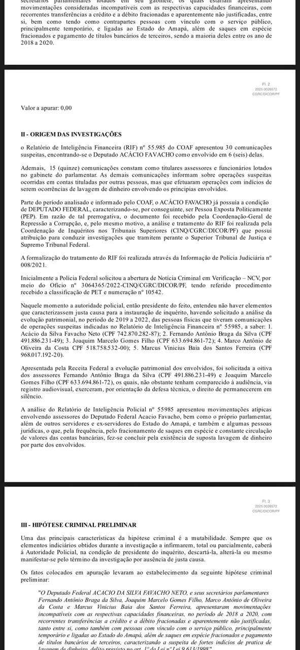 De acordo com o Inquérito Policial nº 2025.0026572, instaurado pela Polícia Federal por determinação da Ministra Cármen Lúcia, o nome de Marcus Vinícius aparece entre os principais operadores financeiros de movimentações consideradas “atípicas”, com forte indício de fracionamento de valores, saques em espécie e transações com empresas e servidores ligados ao Estado do Amapá, incompatíveis com seus rendimentos como secretário parlamentar.